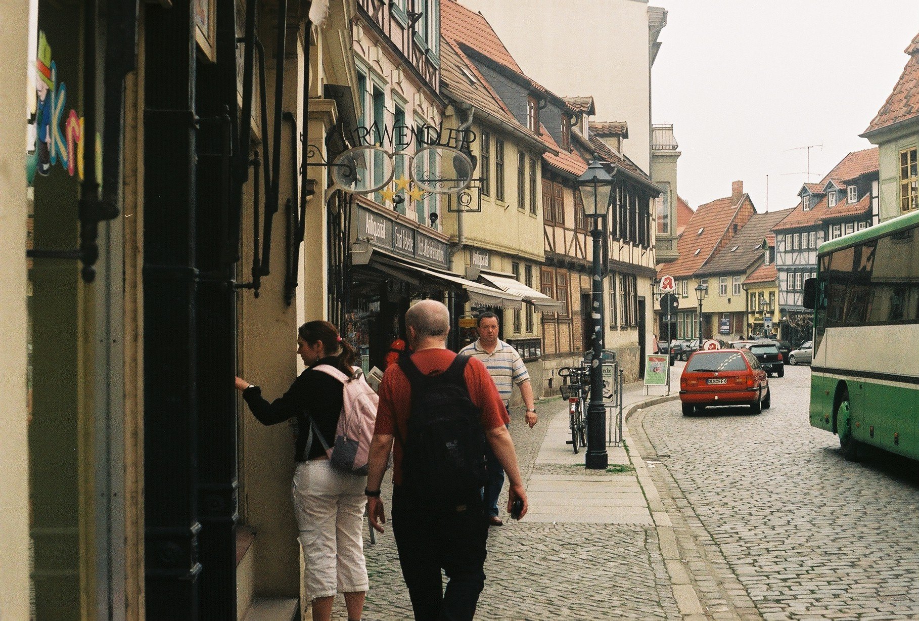 Farbphoto: Die Pölkenstraße in Quedlinburg mit dem Optiker Christian Wendler und dem Antiquariat und Buchhandlung Gebecke. Mai 2009.