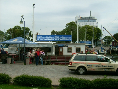 Farbfoto: Verkauf von Fischbrötchen und Backfisch von einem Schiff aus in Warnemünde im Jahre 2009. Und ein Taxi. Fotograf: Bernd Paepcke.